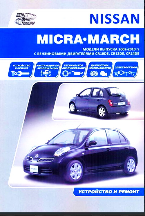 Иллюстрированное справочно-информационное Руководство по ремонту Nissan March / Micra, руководство по эксплуатации и техническому обслуживанию автомобилей Nissan March / Micra с 2002 г. выпуска, оборудованных бензиновыми двигателями CR10DE, CR12DE, CR14DEВ. Ремонт Ниссан Марч. Устрйойство, эксплуатация, техническое обслуживание, диагностика. Электрические схемы.