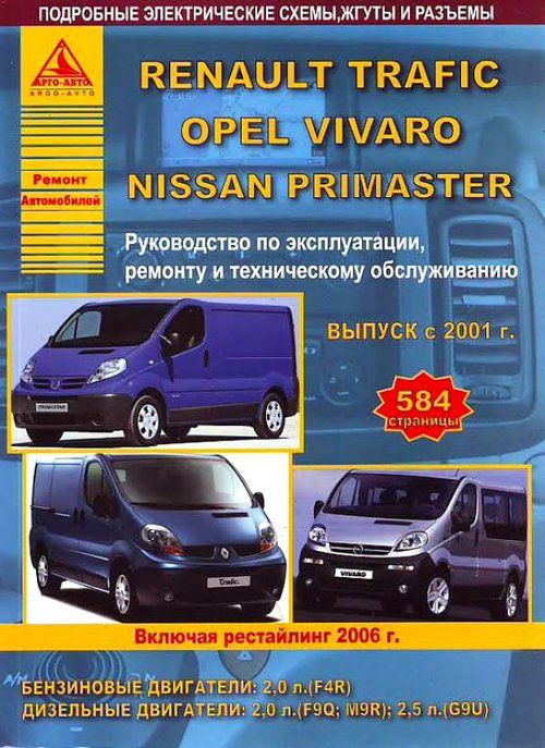 Книга по ремонту Ниссан Примастар / Опель Виваро / Рено Трафик, руководство по эксплуатации и техническому обслуживанию, устройство Nissan Primaster / Opel Vivaro / Renault Trafic с 2001 года выпуска (рестайлинг 2006 года). В книге собраны подробные сведения об автомобилях перечисленных моделей, оборудованных бензиновыми двигателями рабочим объемом 2,0 л. (F4R), а также дизельными – рабочим объемом 2,0 л. (F9Q, M9R), 2,5 л. (G9U). Ремонт Ниссан Примастар. Эксплуатация, техобслуживание, устройство, электрические схемы, жгуты, разъемы.
