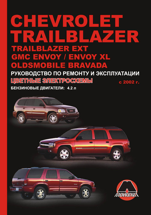 Справочно-информационное с подробными иллюстрациями пособие Руководство по ремонту Oldsmobile Bravada / Chevrolet TrailBlazer / Trailblazer EXT / GMC Envoy / Envoy XL, а также руководство по эксплуатации и техническому обслуживанию леворульных и праворульных автомобилей Oldsmobile Bravada / Chevrolet TrailBlazer / Trailblazer EXT / GMC Envoy / Envoy XL, производственный выпуск которых начат в 2002 году. Внедорожники оборудуются бензиновыми двигателями рабочим объемом 4,2 л.