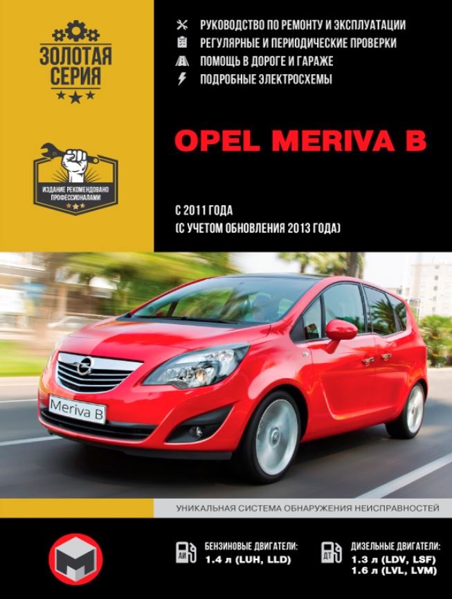 Руководство по ремонту Opel Meriva B, инструкция по эксплуатации Опель Мерива В, книга по обслуживанию автомобилей Opel Meriva B с 2011 г. выпуска и рестайлинговых моделей с 2013 г. выпуска, оборудованных бензиновыми двигателями LUN, LLD рабочим объемом 1,4 литра и дизельными двигателями LDV, LSF, LVL, LVM рабочим объемом 1,3 и 1,6 литра. Подробная информация по ремонту. Обслуживание. Эксплуатация. Электросхемы Опель Мерива В.