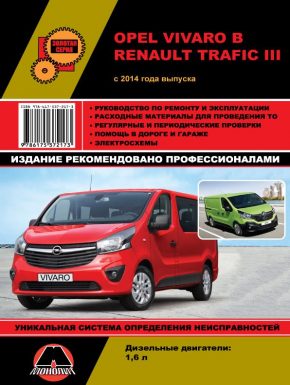 Справочно-информационная инструкция по ремонту Opel Vivaro / Renault Trafic 3, а также руководство по техническому обслуживанию и эксплуатации автомобилей Опель Виваро / Рено Трафик 3 с 2014 года выпуска. Машины оснащены дизельными двигателями рабочим объемом 1,6 л, мощностью 90 / 115 / 120 / 140 л.с. Ремонт Опель Виваро. Инструкция по эксплуатации и ТО. Помощь в дороге и гараже. Система определения неисправностей. Схемы электрических соединений.