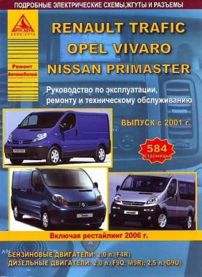 Книга по ремонту Опель Виваро / Рено Трафик / Ниссан Примастар, а также инструкция по эксплуатации и техническому обслуживанию, устройство Opel Vivaro / Renault Trafic / Nissan Primaster с 2001 года выпуска, включая рестайлинг 2006 года. В пособии собрана подробная информацию об автомобилях перечисленных моделей, оборудованных бензиновыми двигателями рабочим объемом 2,0 л. (F4R), а также дизельными – рабочим объемом 2,0 л. (F9Q, M9R), 2,5 л. (G9U). Ремонт Опель Виваро. Эксплуатация, ТО, устройство. Электрические схемы, жгуты, разъемы.