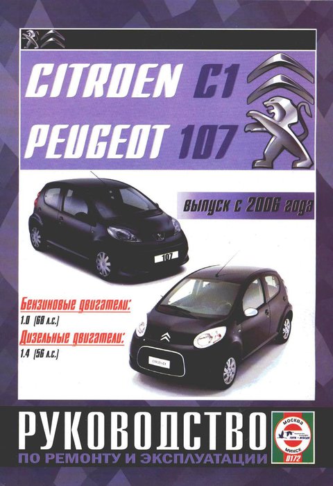 Иллюстрированное справочно-информационное издание Руководство по ремонту Peugeot 107, Citroen C1, а также руководство по техническому обслуживанию и эксплуатации, устройство Peugeot 107, Citroen C1 с 2006 года выпуска, оборудованных бензиновыми двигателями рабочим объемом 1,0 (68 л.с.), а также дизелями литражом 1,4 (56 л.с.).