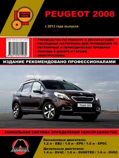 Вашему вниманию предлагается очередное ремонтное пособие Золотой серии популярного автоиздательтсва Монолит. Все мануалы этой серии отличаются тем, что включают в себя только качественную, надежную и многократно проверенную информацию о правилах эксплуатации автомобилей и его технического обслуживания, о специфике проведения работ по диагностике, ремонту и регулировке систем, узлов и агрегатов Peugeot 2008.