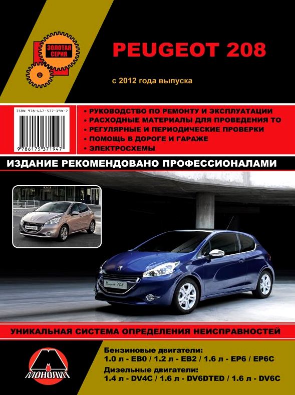 Иллюстрированная книга по ремонту Peugeot 208, а также инструкция по техническому обслуживанию и эксплуатации автомобилей Пежо 208 с 2012 года выпуска, оборудованных бензиновыми двигателями EB0 (1 л.), EB2 (1,2 л.), EP6 (1,6 л.), EP6C (1,6 л.), а также дизельными двигателями DV4C (1,4 л.), DV6DTED (1,6 л.), DV6C (1,6 л.). Мощность: 68 / 68D / 82 / 92D / 115D / 120 / 155 л. с. Ремонт Пежо 208. Инструкция по эксплуатации. Рекомендации по ТО. Схемы электрооборудования.