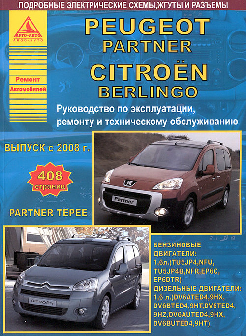 Информационно-справочное, снабженное иллюстрациями пособие Книга по ремонту Peugeot Partner / Peugeot Partner Tepee / Citroen Berlingo, а также руководство по эксплуатации и процедурам связанным с техобслуживанием, устройство Peugeot Partner / Peugeot Partner Tepee / Citroen Berlingo, впервые появившихся в 2008 году и оборудованных бензиновыми двигателями TU5JP4, NFU, TU5JP4B, NFR, EP6C, EP6DTR рабочим объемом 1,6 л. и дизелями DV6ATED4, 9HX, DV6BTED4, 9HT, DV6TED4, 9HZ, DV6AUTED4, 9HX, DV6BUTED4, 9HT рабочим объемом 1,6 л. Ремонт Пежо Патрнер, эксплуатация, обслуживание, схемы электрооборудования.