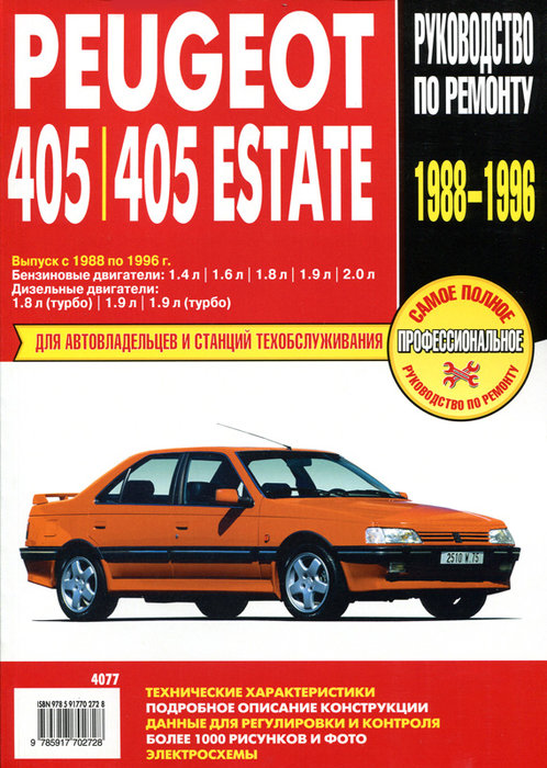 Справочно-информационное иллюстрированное издание Пособие по ремонту Пежо 405, Пежо 405 Эстейт, а также устройство, руководство по эксплуатации и техническому обслуживанию, технические характеристики Peugeot 405 / Peugeot 405 Estate (тип 15В / 4В) в кузове и универсал с передним приводом. Эта модель производилась с 1988 по 1996 год во Франции, на нее устанавливались бензиновые двигатели рабочим объемом 1,4, 1,6, 1,8, 1,9 и 2,0 л., а также дизели литражом 1,8 и 1,9.