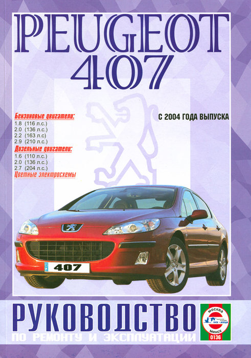 Справочное издание Руководство по ремонту Peugeot 407, а также руководство по эксплуатации и техническому обслуживанию, устройство автомобилей Peugeot 407 с 2004 года выпуска, оборудованных бензиновыми двигателями рабочим объемом 1,8, 2,0, 2,2, 3,0 л., а также дизельными двигателями рабочим объемом 1,6, 2,0 и 2,7 л. Ремонт узлов и агрегатов. Электрические схемы. Эксплуатация и ТО