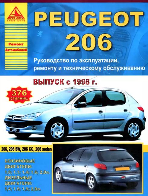 Книга по ремонту Пежо 206, руководство по ремонту, эксплуатации и техническому обслуживанию автомобилей Peugeot 206, 206 SW, 206 CC, 206 sedan с 1998 г. выпуска, оборудованных бензиновыми двигателями рабочим объемом 1,0, 1,1, 1,4, 1,6, 2,0 л., а также дизельными двигателями рабочим объемом 1,4, 1,6, 1,9, 2,0 л.