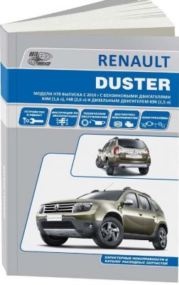 Иллюстрированная информационно-справочная книга по ремонту Renault Duster, описание устройства Renault Duster, руководство по повседневной эксплуатации и техобслуживанию Renault Duster. Выпуск Рено Дастер осуществлялся с 2010 года, оснащена машина бензиновыми моторами K4M литражом 1,6 и дизелем K9K литражом 1,5. Ремонт узлов и агрегатов Renault Duster первого поколения. Неисправности. Эксплуатация. Обслуживание. Каталог расходных запчастей. Схемы электрических соединений.