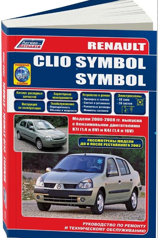 Руководство по ремонту, эксплуатации и техническому обслуживанию автомобиля Renault Clio Symbol с 2000 г. выпуска (до и после рестайлинга), оборудованных двигателями K7J (1,4 л., 8 клапанов) и K4J (1,4 л., 16 клапанов). Ремонт Рено Клио Симбол. Каталог расходных запчастей. Эксплуатация, устройство, техобслуживание. Электрические схемы.