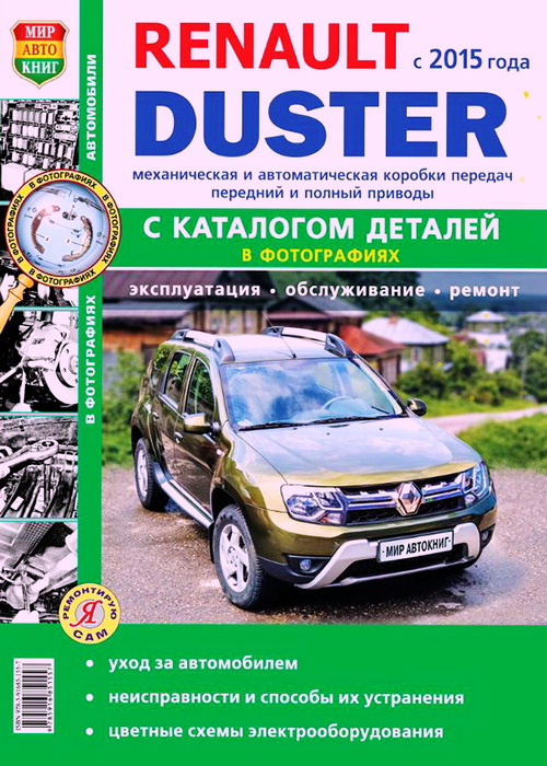 Руководство выпущено издательством «Мир автокниг», его особенностью являются детальные, пошаговые инструкции по диагностике и устранению неполадок в автомобиле Рено Дастер, а также множество цветных электросхем (это позволяет представить проблему наиболее реалистично и быстрее вникнуть в суть необходимых для проведения ремонта операций), с иллюстрированным качественными фотографиями и полным каталогом деталей.