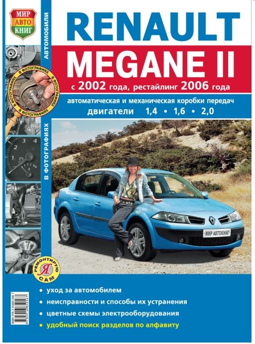 Инструкция по ремонту Рено Меган-2, руководство по ремонту и эксплуатации, пособие по обслуживанию Renault Megane-2 с 2002 г. выпуска (рестайлинг 2006 в книге учтен). Описываются бензиновые двигатели объемом 1,4, 1,6, 2,0 литра, механическая и автоматическая коробка передач.
