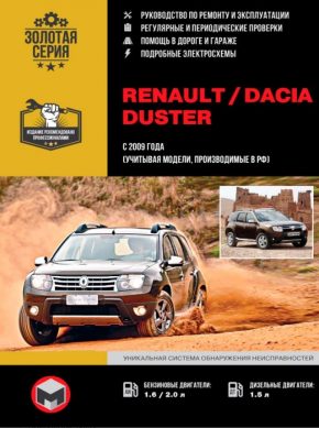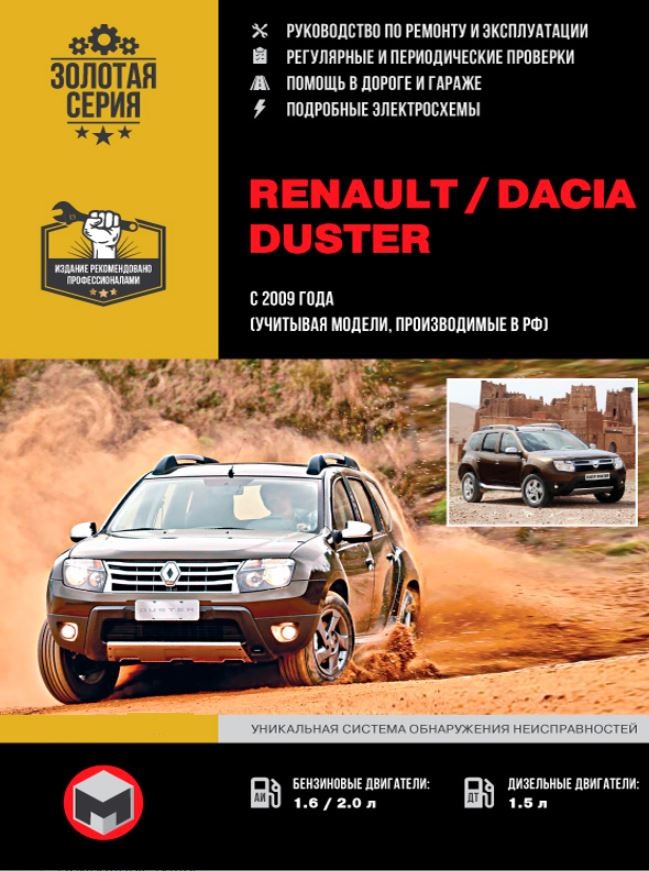 Информационно-справочное иллюстрированное издание руководство по ремонту Рено Дастер, а также руководство по эксплуатации и техническому обслуживанию Рено Дастер /Дачиа Дастер, устройство Renault Duster / Dacia Duster, которые выпускаются с 2009 г. (включая модели собранные в РФ), оборудуются бензиновыми силовыми агрегатами рабочим объемом 1,6, 2,0 л. и дизелем рабочим объемом 1,5 л. Мощность моторов составляет 82 / 102 / 105 л.с. Ремонт узлов и агрегатов. Помощь в дороге и гараже. Эксплуатация и техобслуживание Рено Дастер.