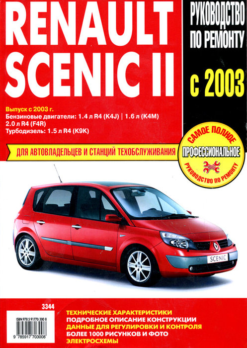 Справочное профессиональное иллюстрированное издание Руководство по обслуживанию Рено Сценик 2, а также руководство по эксплуатации и ремонту компактвэнов Renault Scenic второго поколения, выпуск которых производится с 2003 года. Автомобиль оборудуется бензиновыми двигателями литражом 1,4, 1,6, 2,0 и турбодизелем рабочим объемом 1,5 л. Оснащена модель 5-ти ступенчатой МКП или 4-х ступенчатой АКП.