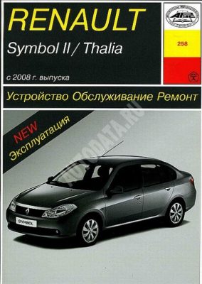 Справочно-информационное пособие руководство по ремонту Рено Симбол 2, Рено Талия, а также руководство по эксплуатации и техническому обслуживанию Рено Симбол 2, Рено Талия, устройство автомобилей Рено Симбол 2, Рено Талия с 2008 г. выпуска, оборудованных бензиновыми моторами рабочим объемом 1,4, 1,6 л., оснащенные 5-ти ступенчатой РКПП либо 4-х ступенчатой АТ.