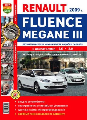 Справочное иллюстрированное в цвете руководство по ремонту Renault Fluence / Renault Megane 3, устройство, руководство по эксплуатации и техническому обслуживанию Рено Флюенс/ Renault Megane III, которые выпускаются с 2009 года в кузовах седан, 5-ти дверный хетчбек, универсал и купе. Оснащаются модели бензиновыми двигателями рабочим объемом 1,6, 2,0 л. АКПП и МКПП. Ремонт Рено Флюенс. Цветные фото. Инструкция по эксплуатации. Электросхемы.