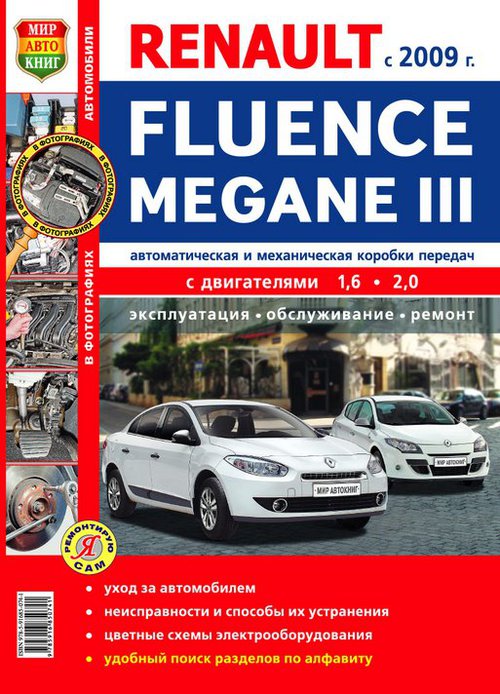 Справочное иллюстрированное в цвете руководство по ремонту Renault Megane 3 / Renault Fluence, устройство, руководство по эксплуатации и техническому обслуживанию Renault Megane III / Renault Fluence, которые выпускаются с 2009 года в кузовах седан, 5-ти дверный хетчбек, универсал и купе. Оснащаются модели бензиновыми двигателями рабочим объемом 1,6, 2,0 л. АКПП и МКПП. Ремонт Рено Меган-3. Цветные фото. Инструкция по эксплуатации. Электросхемы.