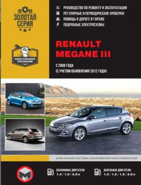 Информационно-справочное, с многочисленными иллюстрациями руководство по ремонту Renault Megane 3, а также книга по техническому обслуживанию Renault Megane 3 и книга по эксплуатации Renault Megane 3, устройство Renault Megane 3 с 2008 года выпуска и моделей, подвергнутых рестайлингу в 2012 году. Рено Меган 3 оснащается бензиновыми агрегатами литражом 1,4, 1,6, 2,0 и дизелями, рабочий объем которых составляет 1,5, 1,6, 1,9, 2,0 л. Мощность моторов 85, 105, 110, 130, 140, 150, 160 л.с. Ремонт Рено Меган-3. Инструкция по эксплуатации и техобслуживанию. Схемы электрических соединений. Система определения неисправностей.