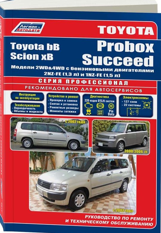 Справочно-информационное пособие Руководство по ремонту Scion xB / Toyota bВ, Probox, Succeed, а также техническое обслуживание Scion xB, эксплуатация и устройство Scion xB 2003-2006 гг. выпуска / Toyota bВ модели 2WD & 4WD 2000-2005 гг. выпуска, Toyota Probox, Succeed с 2002 г. выпуска, оборудованных бензиновыми 2NZ-FE (1,3 л) и 1NZ-FE (1,5 л) двигателями. Ремонт узлов и агрегатов Сцион ХВ