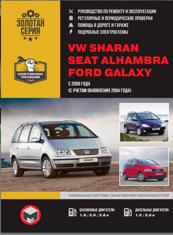 Справочное иллюстрированное издание Пособие по ремонту Сеат Алхамбра, Фольксваген Шаран, Форд Галакси, устройство Сеат Алхамбра, Фольксваген Шаран, Форд Галакси, руководство по эксплуатации и техническому обслуживанию Seat Alhambra / Volkswagen Sharan / Ford Galaxy, которые выпускаются с 2000 года, а также рестайлинговые модели с 2004 г. выпуска и оборудованы бензиновыми моторами литражом 1,8, 2,0, 2,8, а также дизелями литражом 1,9 и 2,0. Ремонт узлов и агрегатов. Эксплуатация, ТО, электрические схемы. Система определения неисправностей.