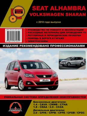 Профессиональное руководство по ремонту Seat Alhambra / VW Sharan, инструкция по техническому обслуживанию и эксплуатации автомобилей Сеат Алхамбра / Фольксваген Шаран с 2010 года выпуска, оборудованных бензиновыми двигателями рабочим объемом 1,4 л. (CAVA / CNWB / СTHA), 1, 8 л. (CDAA), 2,0 л. (CCZA), а также дизельными двигателями рабочим объемом 2,0 л. (CFFA / CFFB / CFFE / СFGB / CFGC).