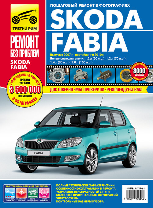 Цветное, богато проиллюстрированное справочное издание руководство по ремонту Шкода Фабия, а также инструкция по эксплуатации и техническому обслуживанию Skoda Fabia, устройство Skoda Fabia с 2007 г. выпуска, а также книга по ремонту рестайлинговой модели с 2010 года, оборудованных бензиновыми моторами рабочим объемом 1,2 (60 л.с. и 70 л.с.), 1,4 (86 л.с.) и 1,6 л. Ремонт Шкода Фабия. Цветные фотография. Инструкция по эксплуатации. Схемы электрооборудования.