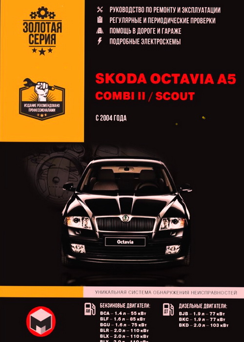 Пособие по ремонту Skoda Octavia A5 / Combi II / Scout, пособие по эксплуатации и техническому обслуживанию автомобилей Skoda Octavia A5 / Octavia Combi II / Octavia Scout с 2004 г. выпуска, оборудованных бензиновыми двигателями рабочим объемом 1,4, 1,6, 2,0 л., а также дизельными двигателями рабочим объемом 1,9, 2,0 л. Ремонт Шкода Октавия А5. Инструкция по эксплуатации. Электросхемы