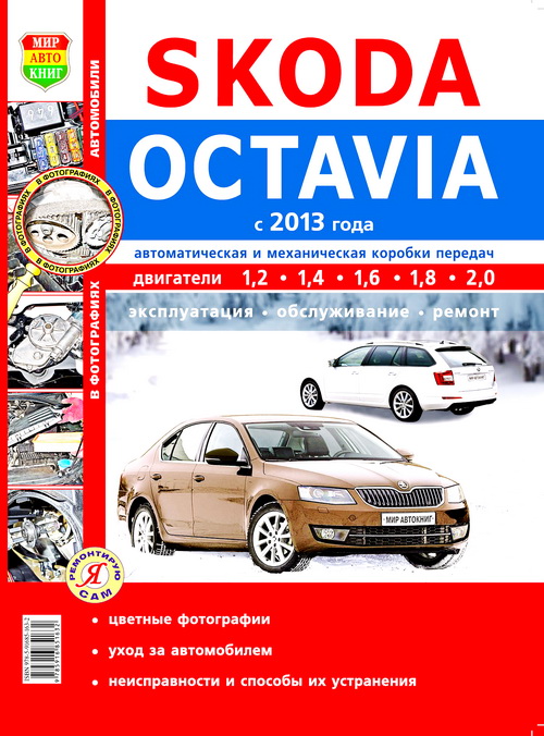 Книга по ремонту Skoda Octavia A7, руководство по ремонту, инструкция по эксплуатации, пособие по техническому обслуживанию Шкода Октавия третьего поколения, с 2013 г. выпуска, оборудованных бензиновыми двигателями рабочим объемом 1,2, 1,4, 1,6, 1,8, 2,0 литра и дизельным двигателем рабочим объемом 2,0 литра, автоматической и механической коробкой передач.