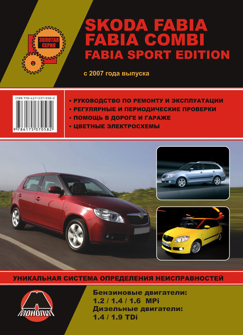 Информационно-справочное иллюстрированное издание Книга по ремонту Skoda Fabia / Fabia Combi / Fabia Sport Edition, а также руководство по эксплуатации и техническому обслуживанию, устройство автомобилей Skoda Fabia / Skoda Fabia Combi / Skoda Fabia Sport Edition с 2007 года выпуска. Модели оборудуются бензиновыми двигателями рабочим объемом 1,2, 1,4, 1,6 л., а также дизельными двигателями рабочим объемом 1,4 и 1,9 л. Ремонт Шкода Фабия. Рекомендации по эксплуатации. Регулярные и периодические проверки. Помощь в дороге и гараже. Схемы электрооборудования.