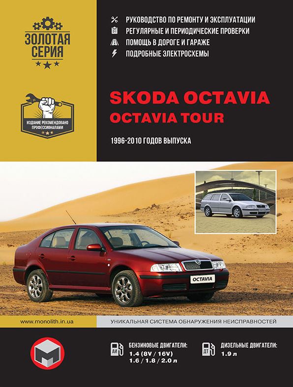 Ремонтное справочное руководство Skoda Octavia / Skoda Octavia Tour, руководство по эксплуатации и техническому обслуживанию автомобилей Skoda Octavia / Skoda Octavia Tour 1996-2010 годов выпуска. Автомобили Шкода Октавия, Шкода Октавия Тур оборудованы бензиновыми двигателями рабочим объемом 1,4, 1,6, 1,8, 2,0 л., а также дизельными двигателями рабочим объемом 2,0 л. Типы силовых агрегатов: АХР / BСА / АMD / АVU / BFQ / АЕН / АKL / АGU / АRZ / АUM / АRХ / АUQ / АGN / АЕG / АРK / АQY / АZH / АZJ / АTD / АХR. Ремонт Шкода Октавия. Описания регулярных и периодических проверок. Электрические схемы, рекомендации по эксплуатации и ТО Шкода Октавиа.