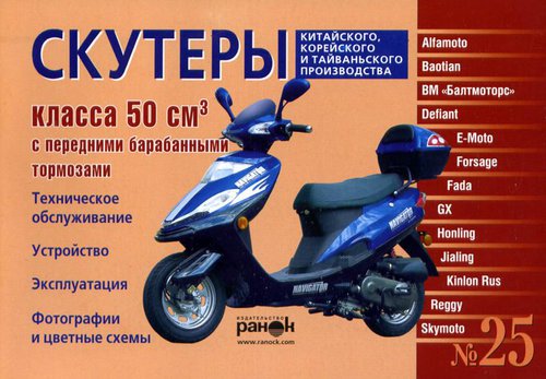 В настоящем пособии рассматриваются модели скутеров китайского, корейского и тайваньского производства, оборудованные карбюраторными четырехтактными двигателями воздушного охлаждения объемом 50 см2 и оснащенные передними барабанными тормозами следующих торговых марок: