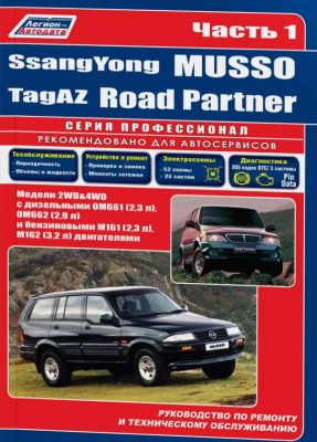 Справочно-информационное подробнейшее иллюстрированное издание Руководство по ремонту SsangYong Musso / TagAZ Road Partner, а также устройство, руководство по эксплуатации и техническому обслуживанию автомобилей Ssang Yong Musso / TagAZ Road Partner, оборудованных дизельными двигателями OM661 (2,3 л.) и ОМ662 (2,9 л.) и бензиновыми двигателями М161 (2,3 л.) и M162 (3,2 л.). Книги продаются в 2-х томах. Ремонт Ссангйонг Муссо. Эксплуатация. Схемы электрических соединений.