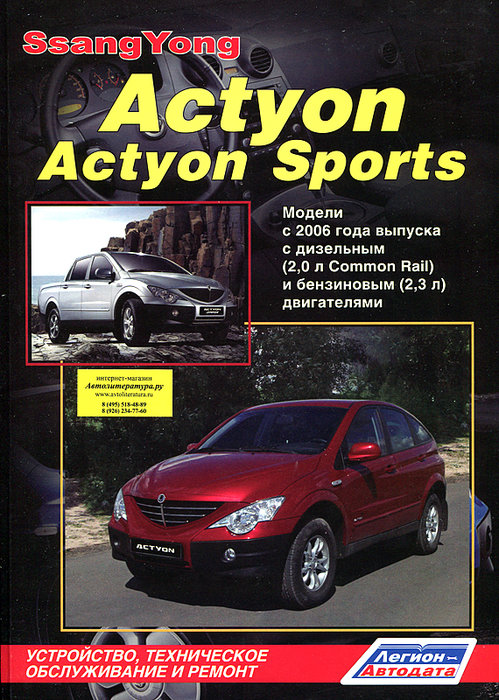 Справочно-информационное иллюстрированное руководство Инструкция по ремонту Ssang Yong Actyon, устройство Ssang Yong Actyon, руководство по эксплуатации и техобслуживанию Ссанг Йонг Актион с 2006 года выпуска по 2010, включая рестайлинг 2008 года, оборудованных бензиновым двигателем G23D рабочим объемом 2,3 л. (Common Rail), а также дизелем D20DT рабочим объемом 2,0 л. Ремонт Санг Енг Актион. Устройство, диагностика, описание неисправностей. Инструкция по эксплуатации. Каталог расходных запчастей. Схемы электрооборудования. Каталог расходных запчастей. Подробная справочная книга.