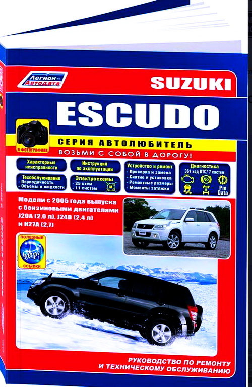Подробное справочно-информационное иллюстрированное пособие инструкция по ремонту Сузуки Эскудо, устройство Сузуки Эскудо, руководство по эксплуатации и техническому обслуживанию Сузуки Эскудо с 2005 г. выпуска. Эти полноприводные внедорожники оборудуются бензиновыми силовыми агрегатами J20A, J24B и H27A рабочим объемом соответственно 2,0, 2,4 и 2,7 л. Ремонт Suzuki Escudo. Инструкция по эксплуатации. Устранение неисправностей. Диагностика, устройство, электросхемы.