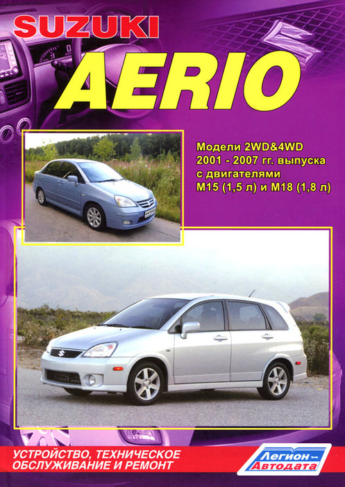 Подробное иллюстрированное справочно-информационное издание Руководство по ремонту Suzuki Aerio, а также руководство по эксплуатации и техническому обслуживанию, устройство Suzuki Aerio (2WD & 4WD). Suzuki Aerio Sedan производились в период с 2001 по 2007 годы, Suzuki Aerio Wagon с 2001 по 2006 гг. выпуска и оборудовались бензиновыми двигателями М15 (1,5 л.) и М18 (1,8 л.). Ремонт Сузуки Аэрио. Эксплуатация. ТО. Устройство. Электрические схемы.