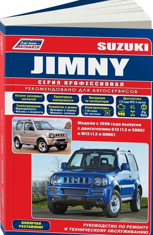 Справочно-информационное издание Руководство по ремонту Сузуки Джимни, а также руководство по эксплуатации и техническому обслуживанию, устройство леворульных Suzuki Jimny с 1998 года выпуска (включая рестайлинг), оборудованных бензиновыми двигателями G13 (1,3 л. SOHC) и М13 (1,3 л. DOHC). Ремонт Сузуки Джимни. Каталог расходных запчастей. Рекомендации по эксплуатации и ТО. Устройство автомобиля. Диагностика неисправностей. Электричские схемы.