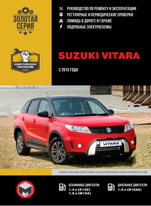 Книга по ремонту Suzuki Vitara, руководство по эксплуатации, инструкция по техническому обслуживанию Сузуки Витара с 2015 г. выпуска, оборудованных бензиновыми двигателями K14C / M16A рабочим объемом 1,4 и 1,6 литра, а также дизельными двигателями D16AA рабочим объемом 1,6 литра. Ремонт Сузуки Витара. Эксплуатация и ТО. Помощь в дороге и гараже. Система определения неисправностей. Схемы электрических соединений.