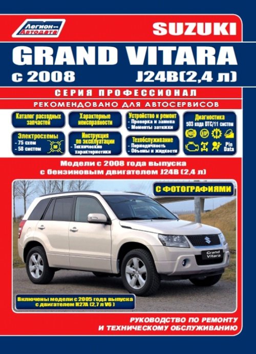 Профессиональная, иллюстрированная в фотографиях, книга по ремонту Suzuki Grand Vitara, инструкция по эксплуатации и техническому обслуживанию автомобилей Сузуки Гранд Витара с 2008 года выпуска, оборудованных бензиновыми двигателями моделей J24B рабочим объемом 2,4 л. Издание также включает данные об автомобилях Сузуки Гранд Витара с 2005 года выпуска, оборудованных двигателями моделей H27A рабочим объемом 2,7 л V6. Серия Профессионал. Ремонт Сузуки Гранд Витара. Каталог расходных запчастей. Рекомендации по эксплуатации и ТО. Устройство автомобиля. Неисправности. Диагностика. Схемы электрических соединений.