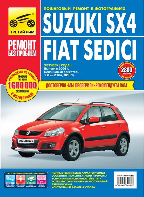 Цветное, богато иллюстрированное информационно-справочное издание Руководство по ремонту Suzuki SX4 / Fiat Sedici, а также устройство, руководство по техническому обслуживанию и эксплуатации автомобилей Suzuki SX4 / Fiat Sedici в кузове седан и хэтчбек с 2006 г. выпуска, оборудованных бензиновыми двигателями M16A рабочим объемом 1,6 л. (DOHC). Издание содержит более 2800 цветных фотографий, подробно отображающих весь процесс пошагового ремонта автомобиля.