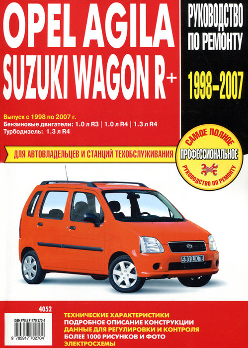 Справочно-информационное иллюстрированное издание Пособие по ремонту Suzuki Wagon R+ / 0pel Agila, устройство, руководство по эксплуатации и техническому обслуживанию Suzuki Wagon R+ / 0pel Agila первого поколения (тип А) в кузове хетчбек, которые выпускались с 1998 по 2007 года в Японии, Польше и Индии, оборудовались бензиновыми двигателями литражом 1,0, 1,2, 1,3, а также турбодизелями литражом 1,3. Модели комплектовались 5-ти ступенчатой МКП или 4-х ступенчатой АКП.