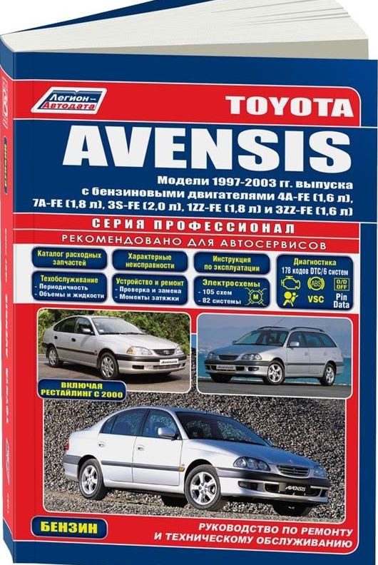 Руководство по ремонту Toyota Avensis, а также руководство по эксплуатации и техническому обслуживанию автомобиля Toyota Avensis 1997-2003 гг. выпуска, оборудованных бензиновыми двигателями 4A-FE (1,6 л), 7A-FE (1,8 л), 3S-FE (2,0 л), 1ZZ-FE (1,8 л) и 3ZZ-FE (1,6 л). Ремонт узлов и агрегатов Тойота Авенсис. Неисправности, диагностика, устройство. Рекомендации по эксплуатации и техобслуживанию. Каталог расходных запасных частей. Электрические схемы.