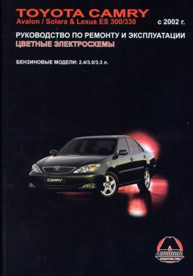 Пособие по ремонту Тойота Камри, Пособие по эксплуатации и техническому обслуживанию автомобилей Toyota Camry, Avalon, Solara, Lexus ES 300 / 330 с 2002 г. выпуска, оборудованных бензиновыми двигателями рабочим объемом 2,4, 3,0, 3,3 л. Подробное справочное пособие. Ремонт Тойота Камри