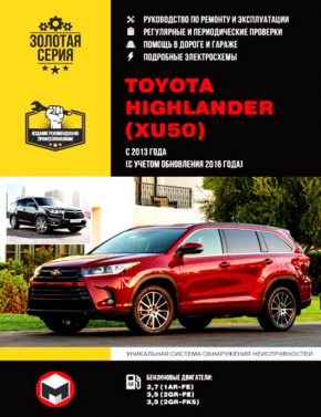 Руководство по ремонту Toyota Highlander XU50, книга по эксплуатации и обслуживанию Тойота Хайлендер с 2013 года выпуска (учитывая обновление 2016 года), оборудованных бензиновыми двигателями 1AR-FE, 2GR-FE, 2GR-FKS, рабочим объемом 2,7 и 3,5 литра.
