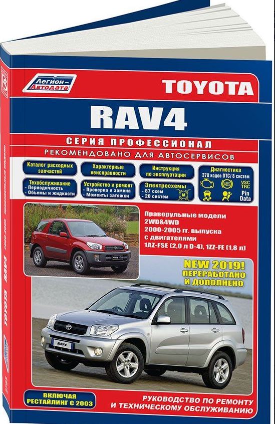 Руководство по ремонту, эксплуатации и техническому обслуживанию, устройство Toyota RAV4. Представлены праворульные модели 2WD & 4WD 2000-2005 гг. выпуска с двигателями 1AZ-FSE (2,0 л. D-4), 1ZZ-FE (1,8 л.). Ремонт праворульных Тойота РАВ4. Инструкция по эксплуатации. Рекомендации по обслуживанию. Неисправности. Электрические схемы.