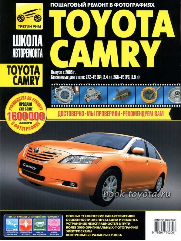 Инструкция по ремонту Toyota Camry, а также руководство по техническому обслуживанию и эксплуатации, устройство Toyota Camry с 2005 в выпуска, оборудованных бензиновыми двигателями 2AZ-FE рабочим объемом 2,4 л. (V4) и 2GR-FE рабочим объемом 3,5 л. (V6).