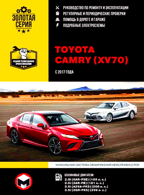 Книга по ремонту Тойота Камри, руководство по техническому обслуживанию и эксплуатации Toyota Camry (XV70) с 2017 г. выпуска, оборудованных бензиновыми двигателями 6AR-FSE, 2AR-FE, A25A-FKS, 2GR-FKS рабочим объемом 2,0, 2,5, 3,5 литра и мощностью 169, 181, 206, 299 л.с.