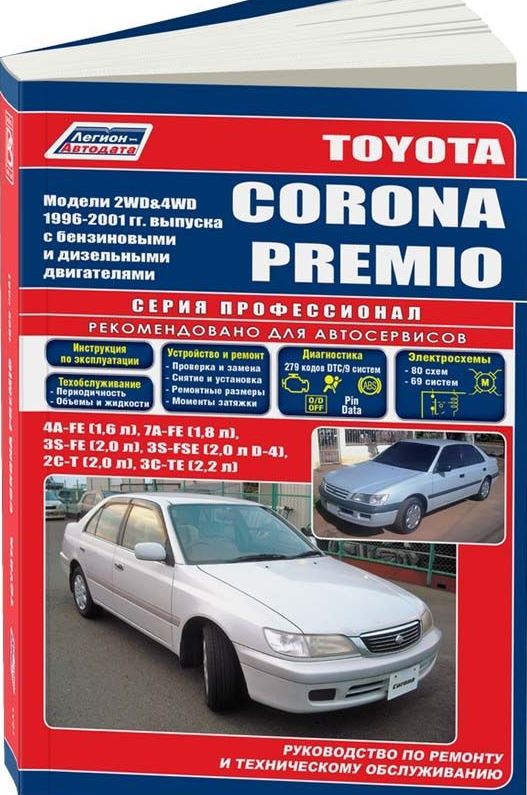 Справочно-информационная книга Руководство по ремонту Toyota Corona Premio, а также руководство по эксплуатации и техническому обслуживанию, устройство Toyota Corona Premio 1996-2001 гг. выпуска, оборудованных бензиновыми двигателями 4A-FE (1,6 л.), 7A-FE (1,8 л.), 3S-FE (2,0 л.) и 3S-FSE (2,0 л., с системой непосредственного впрыска бензина) и дизельными двигателями 2C-T (2,0 л.) и 3C-TE (2,2 л.). Модели 2WD & 4WD. Ремонт Тойота Корона Премио. Устройство. ТО. Эксплуатация. Диагностика. Электрические схемы.