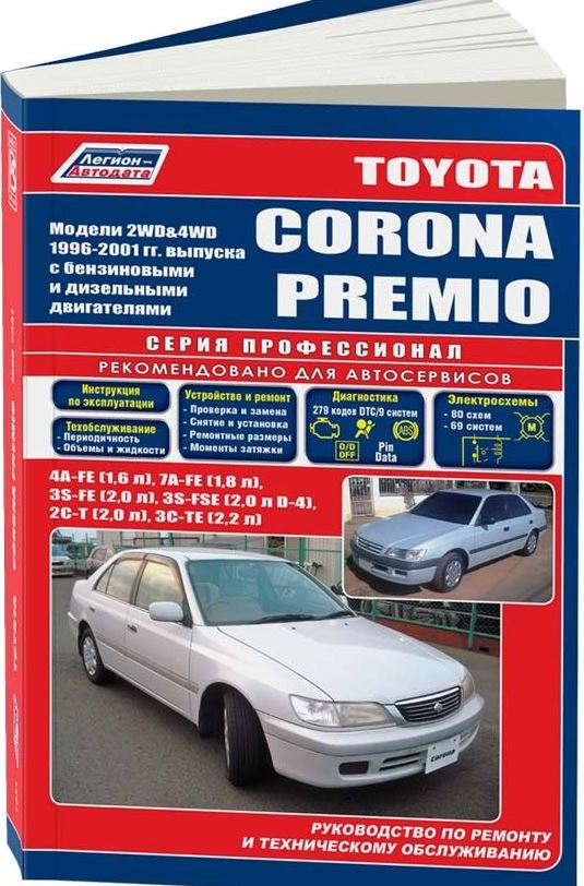 Справочно-информационная книга Руководство по ремонту Тойота Корона Премио, а также руководство по эксплуатации и техническому обслуживанию, устройство Toyota Corona Premio 1996-2001 гг. выпуска, оборудованных бензиновыми двигателями 4A-FE (1,6 л.), 7A-FE (1,8 л.), 3S-FE (2,0 л.) и 3S-FSE (2,0 л., с системой непосредственного впрыска бензина) и дизельными двигателями 2C-T (2,0 л.) и 3C-TE (2,2 л.). Модели 2WD & 4WD. Ремонт Тойота Премио. Эксплуатация, ТО, устройство, электрические схемы.