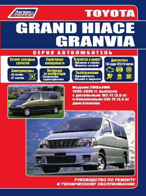 Профессиональное универсальное руководство по ремонту Toyota Grand Hiace, инструкция по эксплуатации и техническому обслуживанию, устройство автомобилей Тойота Гранд Хайэйс 1995-2005 годов выпуска моделей 2WD и 4WD, оборудованных дизельными двигателями 1KZ-TE рабочим объемом 3,0 л и бензиновыми двигателями 5VZ-FE объемом 3,4 л. Ремонт Тойота Гранд Хайс. Устройство, эксплуатация, диагностика. Каталог расходных запчастей. Электрические схемы.